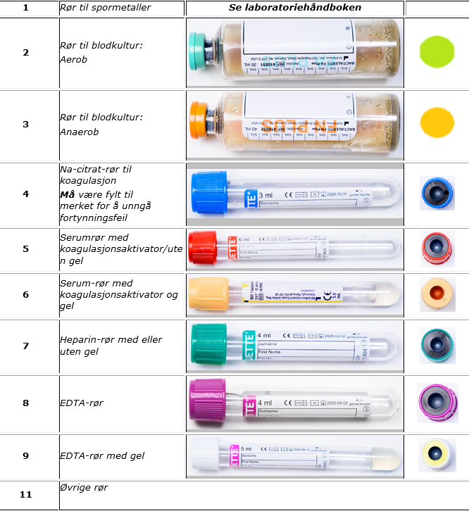 Følgende blodprøverør tas i disse tilfellene: